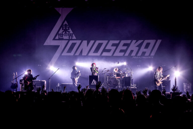 お待ちかねのVAMPSは、映画『スター・ウォーズ』のテーマが場内に流れ、ステージを覆う幕に「EPISODE 666 ATTACK OF THE VAMPIRE」の文字が映し出されると、ランウェイの先端にカイロ・レン、ダース・シディアス、ダース・モールと、スター・ウォーズのダークなキャラクターが登場してライトセーバーで戦いを繰り広げる。3人が相打ちのような形で倒れこむと次は、大勢のストーム・トルーパーを引き連れたJu-ken扮するダース・ベイダーがアリーナを歩いて登場。ダース・ベイダーがひざまづくその先の玉座に鎮座するのは……パドメ・アミダラに扮したHYDEだ。スクリーンにHYDEアミダラの美しい姿が映されると、場内から大きなどよめきがあがる。ヘヴィネスなバンドサウンドが轟く中、玉座に座ったままHYDEアミダラが歌い始めたのは、「DAMNED」。その圧倒的な迫力に息を飲み立ち尽くす人と激しいヘドバンを繰り返す人が入り乱れ、場内はカオス状態だ。