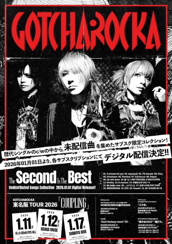 GOTCHAROCKAが2026年1月に東名阪ツアー開催と、歴代シングルc/w曲の中から未配信曲を集めた限定コレクションのサブスク配信が決定。併せて、最新ビジュアルも公開された。詳細は下記をチェック。