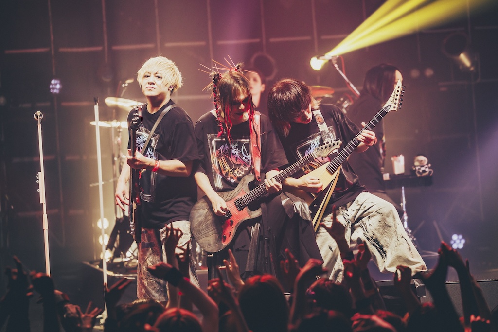 かくして、初手を指すことになったSadieは冒頭から激烈さと壮麗さの混在する「迷彩」をブチあげて、場内をいきなり狂乱の渦へと巻き込んでいくことに。しかも、この曲ではMUCCのYUKKEいわく「ずっと生で観てみたかった」という、ベーシスト・亜季が頼もしいプレイをしていくのと同時に“例の舞い”をみせる姿まで拝むことも叶った。また、続く「under the chaos」ではドラマー・景が叩き出す鉄壁のリズムと、剣と美月がおりなすメタリーなギターアンサンブルに煽られるかたちで、1階客席フロアのみならず2階バルコニー席でもヘッドバンギングに興じる人々が続出。ヘヴィな音像を背景に真緒が多彩なヴォーカリゼイションを提示した「心眼」でも、Sadieならではの貫録ある表現を堪能することが出来たように思う。