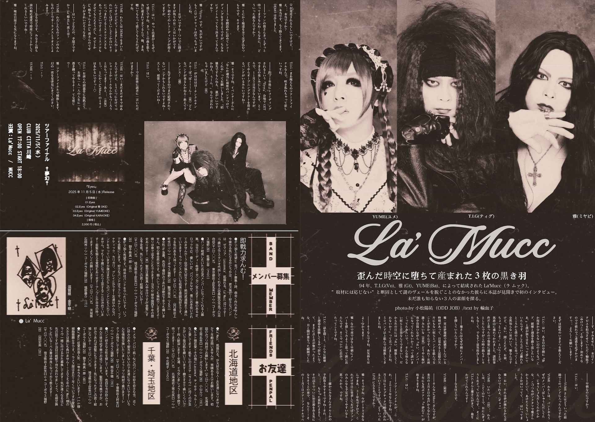 「La’Mucc」とは、T.I.G(Vo)、雅(G)、YUME(B)の3人からなるヴィジュアル系バンド。1994年の歪んだ時空から堕ちて産まれた3枚の黒き羽をコンセプトに、彼らの詳細が明らかになるたびにファンの間で話題を呼んでいた。