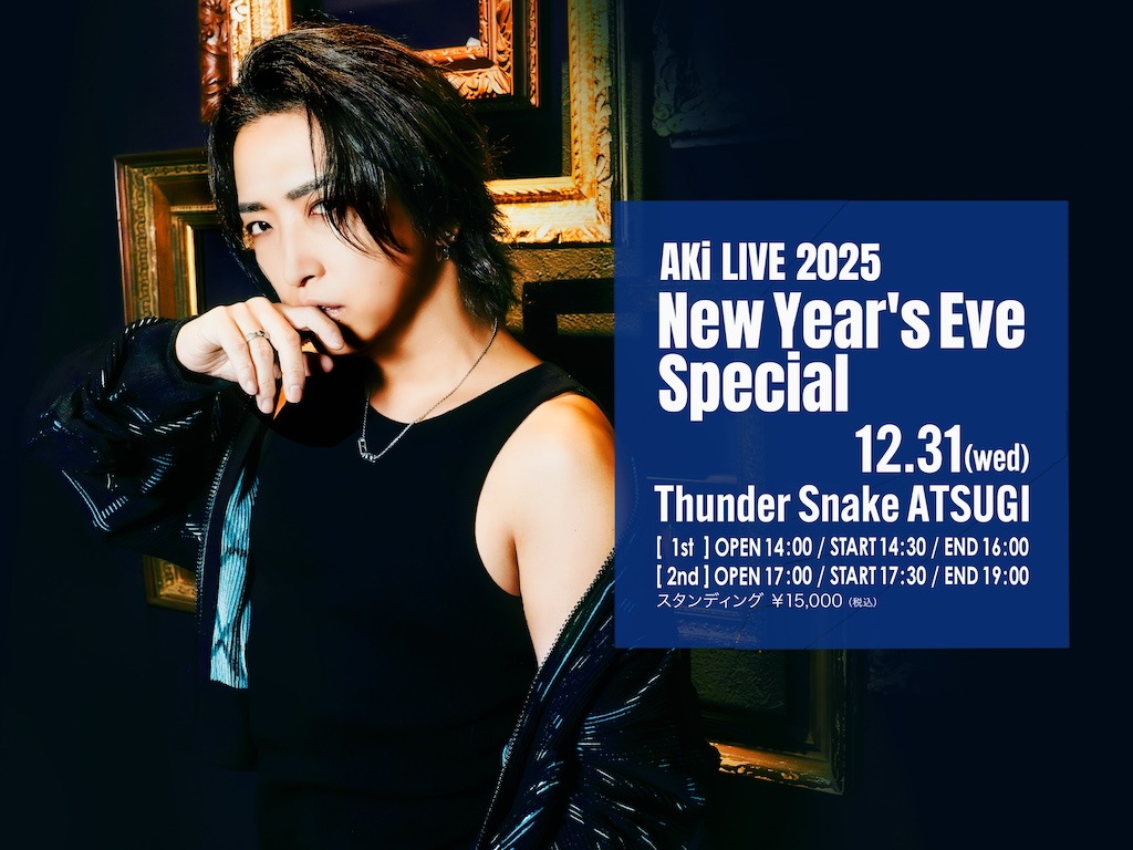 シドの明希によるソロプロジェクト“AKi”が12月31日、一年を締めくくる特別な日に、ホームとなる神奈川・Thunder Snake ATSUGIにて、1日2部公演の「AKi LIVE 2025 New Year’s Eve Special」を開催することが発表となった。2部構成で行われるこの公演は、激動の一年を共に歩んできたファンへ感謝の気持ちを込めて届けられる特別な一日となる。