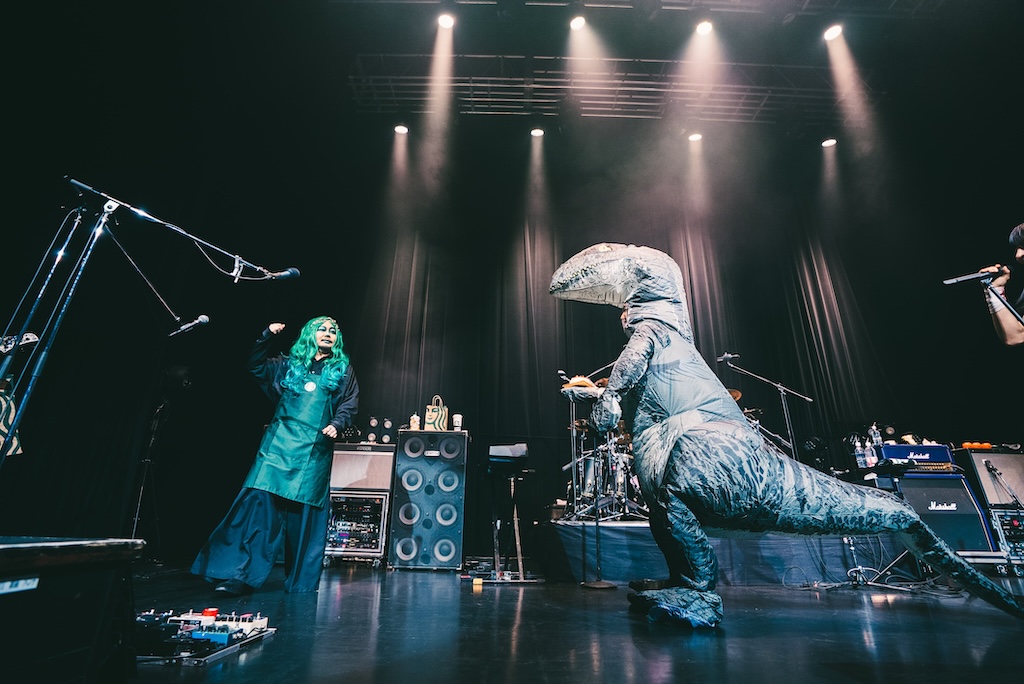 カオスな4人の姿に、オーディエンスはすでにテンションMAX状態。そこに投下された1曲目は「「変身」」。普段とは違う自分に変身した者たちが集結した、この夜にぴったりだ。さらに「「君の子宮を触る」」「ミスターショットガンガール」と、オープニングから怒涛の勢いでハードなナンバーを連発。初っ端からヘッドバンギングの嵐が巻き起こるフロアを前に、メンバーはお互いの格好を見て笑いあう。ステージの上も下も、この状況を心から楽しんでいるようだ。