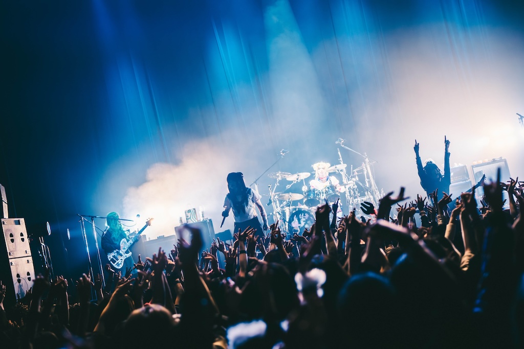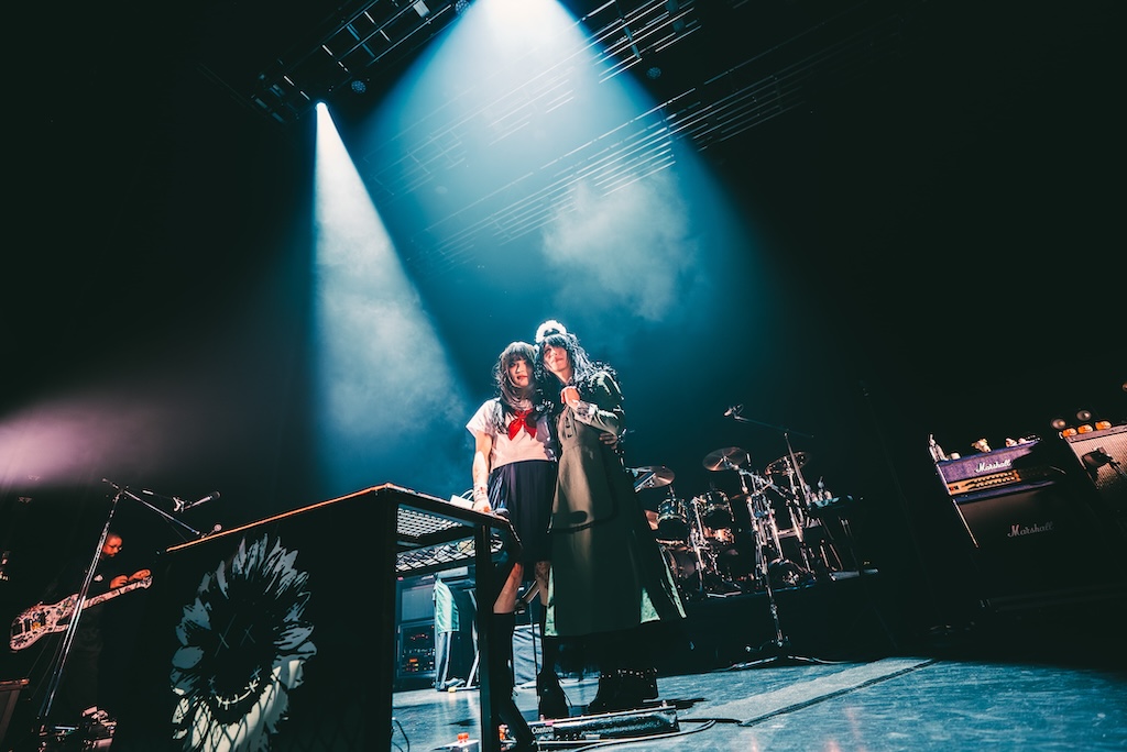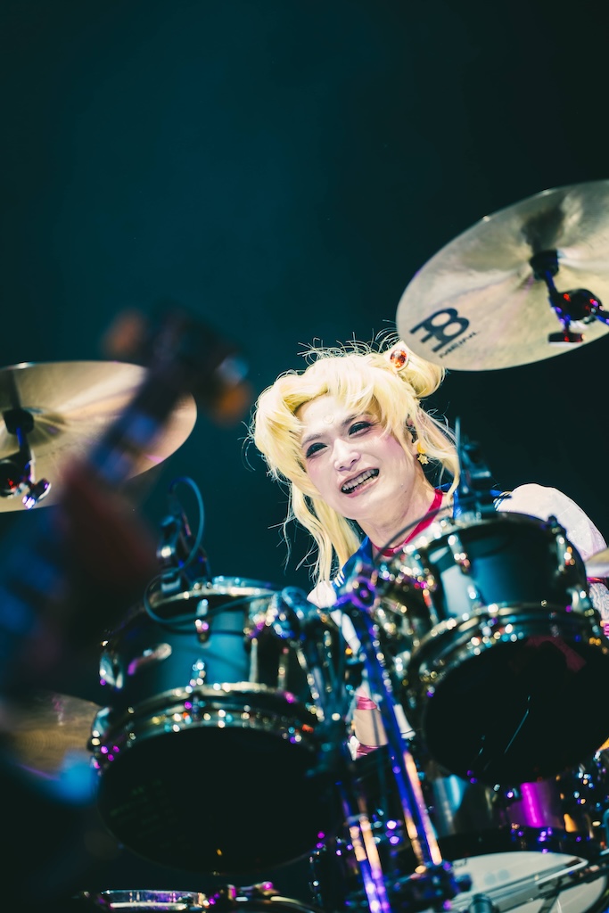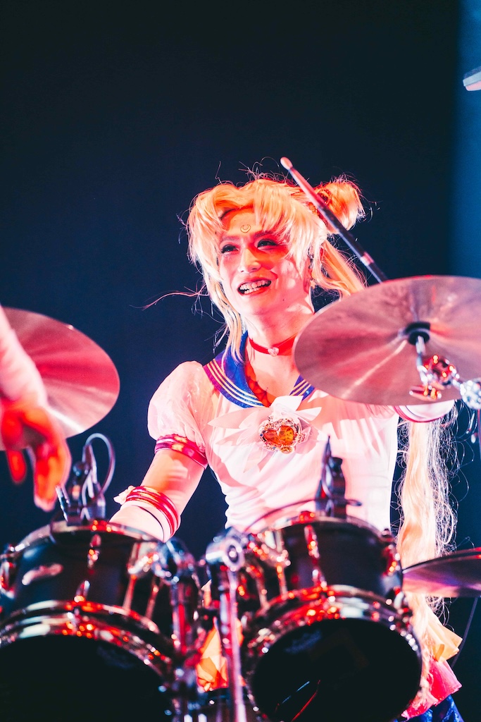 イントロのベースソロでSacchanが虹色のスポットライトを浴びた「肋骨少女」、「あえて言うけど俺はハロウィンなんて大嫌いなんや!」という千秋の天邪鬼な言葉と共に始まった「感染少女」。ここで完全に熱が上がったフロアは、SORAの叩くリズムに合わせて拳を突き上げながら、左右に分かれて道を作っていく。すると「久しぶりにぶつかり合おうか、東京!」と叫んだ千秋がフロアに乱入。「血糊つくから本当に触んないでね!」と念を押しつつ、中央の柵に乗り、オーディエンスとゼロ距離に。SORAの「ムーンプリズムパワー、メイクアップ!」(美少女戦士セーラームーンに変身する際の呪文)という雄叫びを合図に勢いよくWall of Death。ライヴのボルテージは最高潮まで高まっていった。