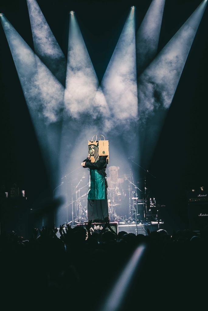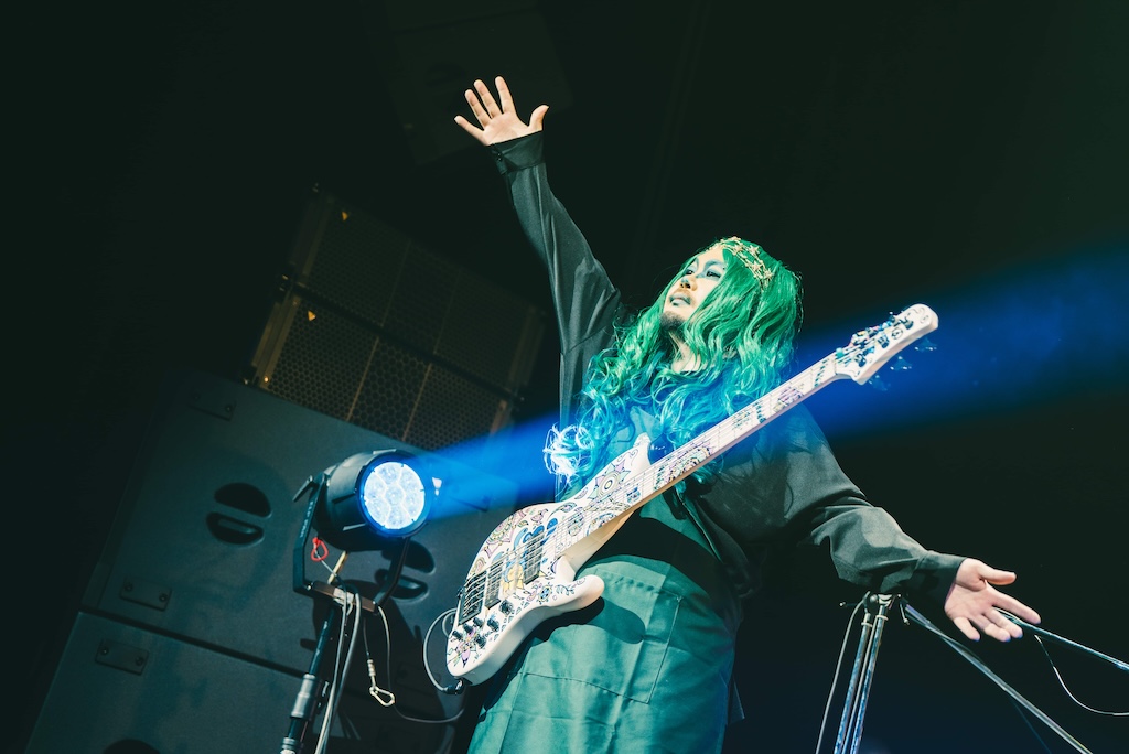 最初に登場したSORA(Dr)は、“ちょっとマッチョな月野うさぎ”。厚い胸板と筋肉質な手足で、ミニスカートのセーラー服はパツパツだ。Miyako(G)は、“かわいいメイドさん”。モスグリーンのロングメイド服に、黒髪ロングのウィッグを被って現れ、その可憐さにフロアからは悲鳴のような歓声が上がる。千秋(Vo,G)は、“俺たちのJK”。彼の定番スタイルでもあるセーラー服にサラサラストレートのハーフツインテールでフロントに立ち、会場を沸かせる。そして、本日の主役であるSacchanは、なんと“スターバックス(以下、スタバ)の袋の人”。見慣れた紙袋の被り物(特注)から顔を覗かせ、緑色のエプロンをつけた姿は、まるで特大の紙袋を被ったスタバ店員のよう。千秋が事前にSNSで「全員女性の恰好」とヒントを出していたものの、誰も想像していなかった斜め上の仮装に、フロアは大爆笑に包まれた。