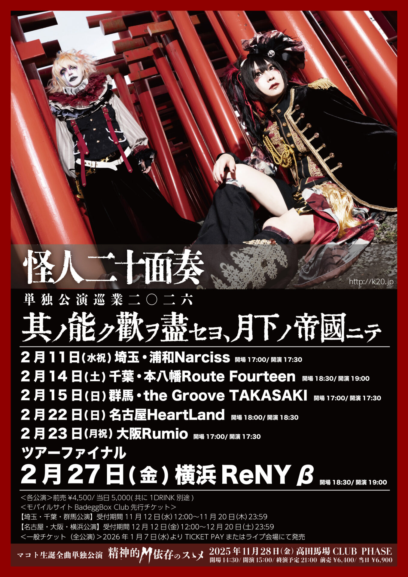 2月11日の浦和Narciss公演を皮切りにスタートする、怪人二十面奏 単独公演巡業二〇二六「其ノ能ク歡ヲ盡セヨ、月下ノ帝國ニテ」は全6公演。