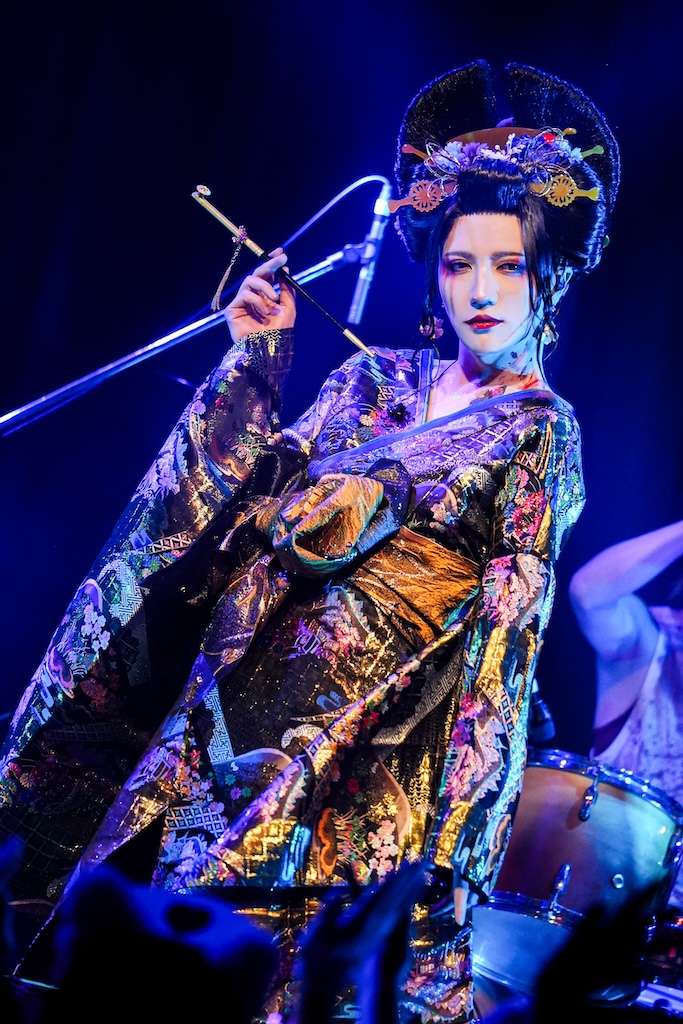 艶やかなる花魁と、おどろおどろしさを醸し出す血塗れゾンビたち。和洋の混在するハロウィンの夜をこの場に創りだしてくれたのは、DAY1とDAY2を通してクレモン最多出場となるTHE MICRO HEAD 4N’Sにほかならない。出演にあたってのプロデュースを手掛けたのはベーシスト・ZEROとのことで、楽器隊メンバーがダークサイドを一手に引き受ける一方、ヴォーカリスト・KEKEが絢爛豪華な立ち居振る舞いをみせていくというアプローチはインパクトが大きく、観衆に対して鮮烈な印象を灼きつけることになった。