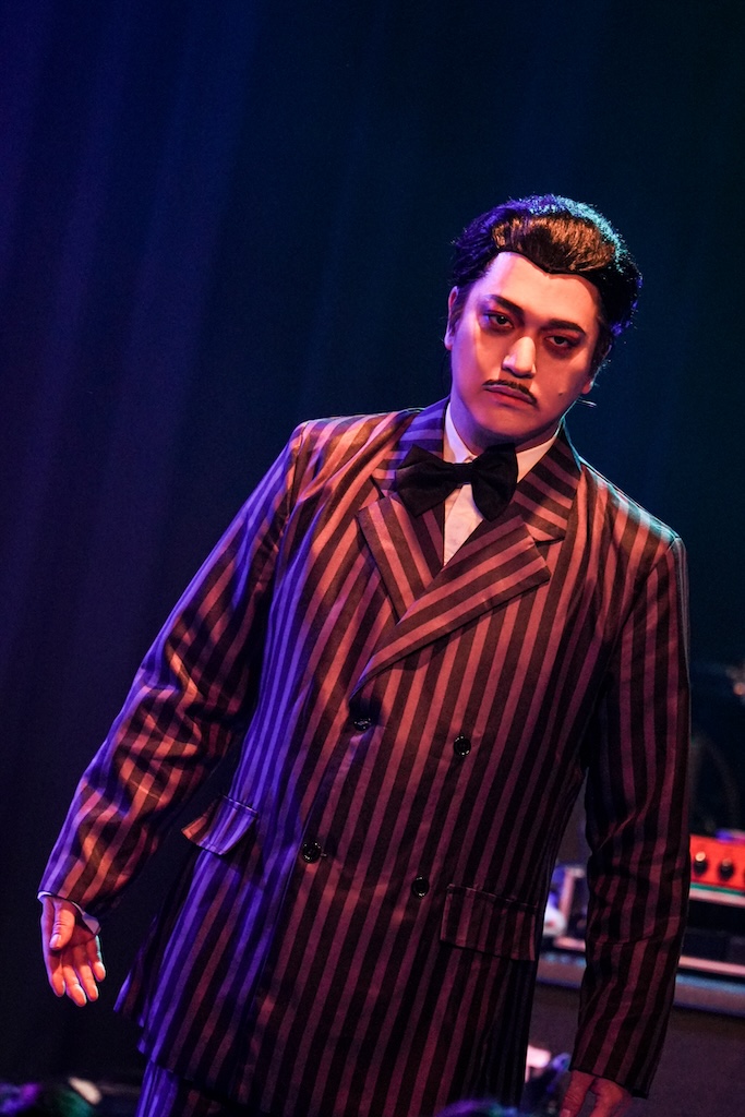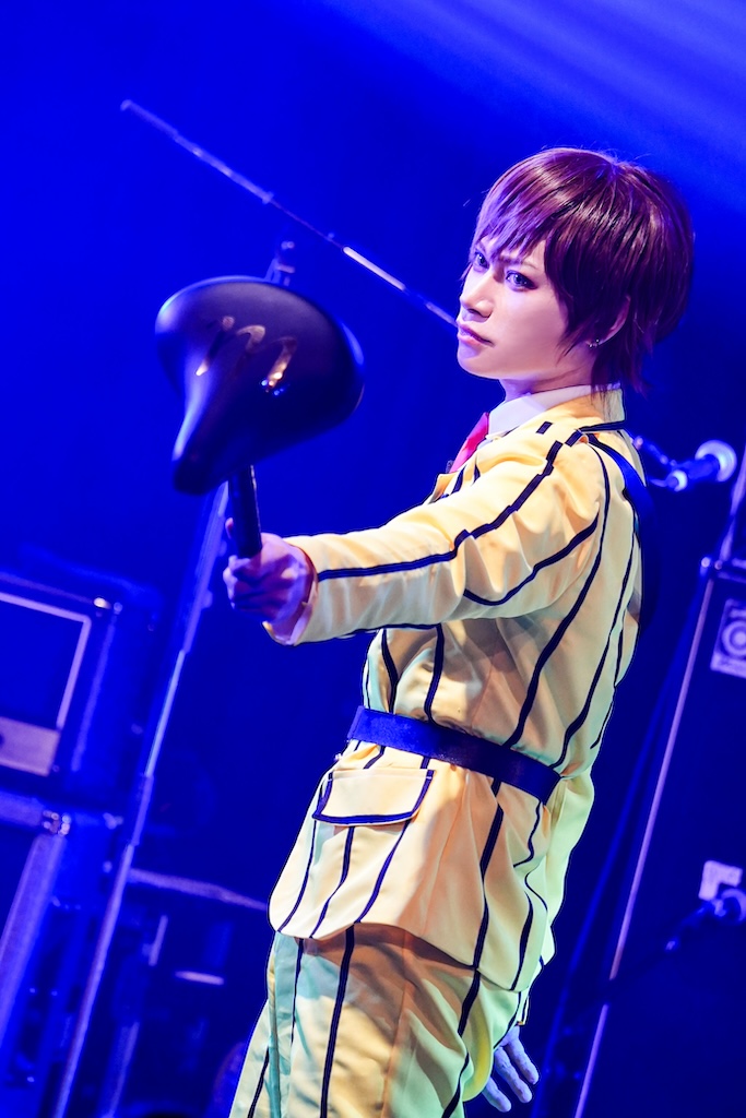擬態ぶりが凄過ぎて、開演前の楽屋ですれ違った時には誰が誰だか全くわからなかったのだが。団長からの紹介を受けて、彼らが『アダムスファミリー』のテーマ曲とともにステージに上がってきた時に、ようやくあれがDuelJewel御一行様だったのかと判明して筆者は横転した次第である(笑)。隼人=ウェンズデー、Shun=モーティシア、祐弥=ラーチ、Natsuki=パグズリー、ばる=ゴメズ。中でも“目のかっぴらき度合い”を本家以上に強調したばるの顔芸は特に強烈で、演奏時はおろか曲間でもずっとそれを継続していたところにプロならではのエンタテインメント魂を感じてしまった。