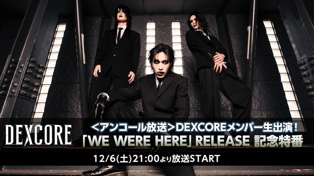 また、ライブ開催前夜となる12月6日21時には、今年7月に放送した『WE WERE HERE』のリリース記念番組のアンコール放送をお届け。架神 -kagami-(Vo)、梦斗 -yumeto-(G)、澄 -TO-RU-(B)が出演し、アルバム制作秘話や“デクスサウンド”の魅力を語っている。 後半のプレミアム会員限定パートでは、バラエティ企画をお届けし、約2時間の放送となる。併せてぜひチェックを。