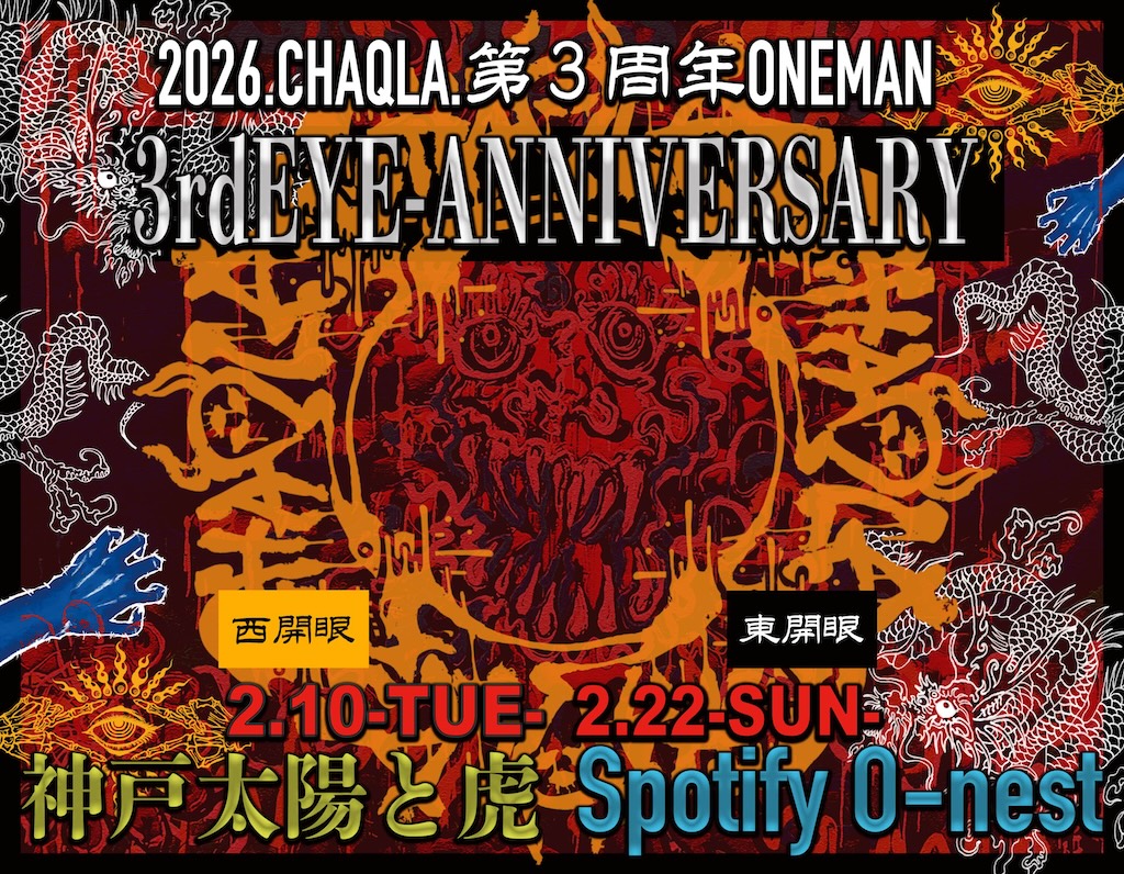 CHAQLA.が、結成3周年を記念したワンマンライヴ「CHAQLA.第3周年ONEMAN【3rdEYE ANNIVERSARY】」の開催を発表した。サブタイトルに掲げられた“西開眼”と“東開眼”の名のもと、2月10日には神戸・太陽と虎にて、結成記念日となる2月22日には東京・渋谷 Spotify O-NESTにてそれぞれワンマンライヴが行われる。