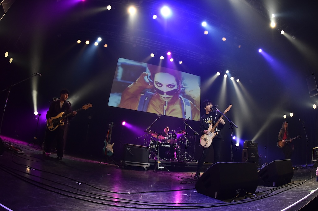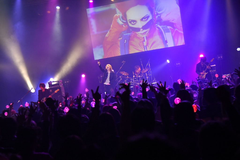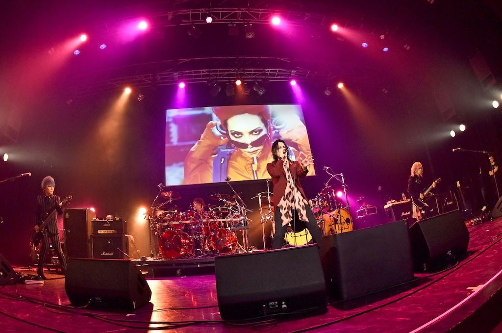 オープニングの映像が流れ、いよいよパーティーの始まりである。MCはお馴染みのDJ浅井博章。彼はこのパーティにはナレーションのみの参加のことも多いが、今日はリアル登場である。今年5月のhide with Spread Beaverワンマンライブの感想などを話したあと、スクリーンの画像を見ながら今日の出演アーティストのラインナップを紹介していく。バンドの名前が呼ばれるたびに歓声と拍手が湧き上がり、イベントへの期待がどんどん膨らんでいく。