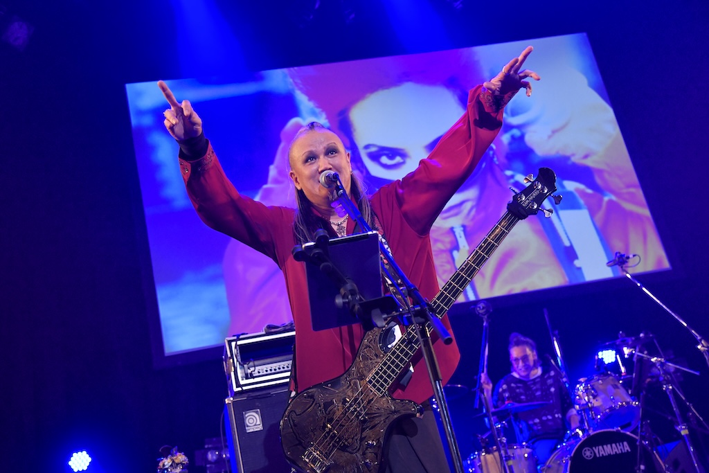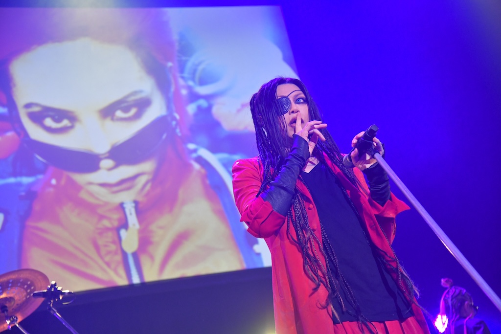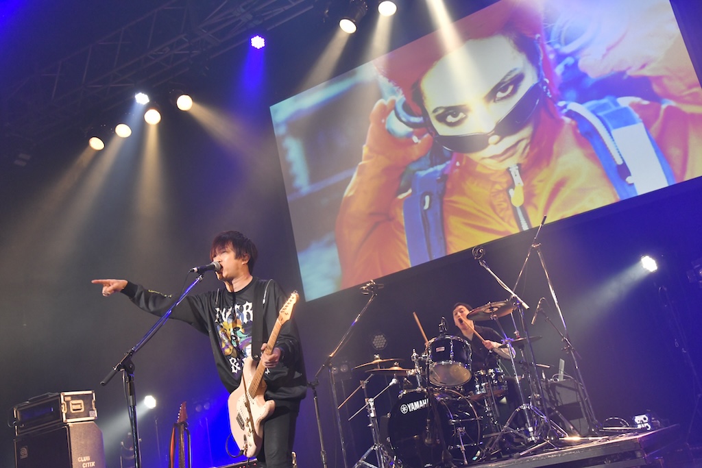 続いて登場したのは、今年25年ぶりに本格再始動したVINYL。90年代にD’ERLANGER~STRAWBERRY FIELDSで活躍した福井祥史(Vo)と元黒夢の鈴木新(G)が結成したユニットで、1996年にhideが世に送り出したコンピレーションアルバム「LEMONed」で鮮烈なデビューを飾った二人組である。彼らはまず1曲目にそのコンピレーションアルバム収録曲の「BE」を演奏。パンキッシュなスピードチューンで、25年のブランクを全く感じさせないプレイはオーディエンスの度肝を抜いた。続いて今年1月にリリースした未発表楽曲集「unreleased」から「KEEP MY SECRET」を演奏し、福井祥史が「1996年の千葉マリンスタジアムから29年、今日も変わらずぶっ飛ばしていくぜ、いいか?」という元気のいい声でMC。独特なハイトーンヴォイスで歌い上げるメロディのはっきりした歌と、自由に弾きまくるギターが絡む楽曲はいかにも90年代的ではあるが、スリリングで心地よい印象を受ける。サポートベースのJUN(Valentine.D.C.)は二人の再始動のきっかけの一つとなった盟友HEATH(X JAPAN)のベースを持ち、HEATHの衣装を身にまとって二人のステージに花を添える。来年はオリジナルの音源のリリースも考えているそうで、hideの仲間がまた1組未来に向けて歩み始めようとしているシーンを見るのは、嬉しい限りだ。