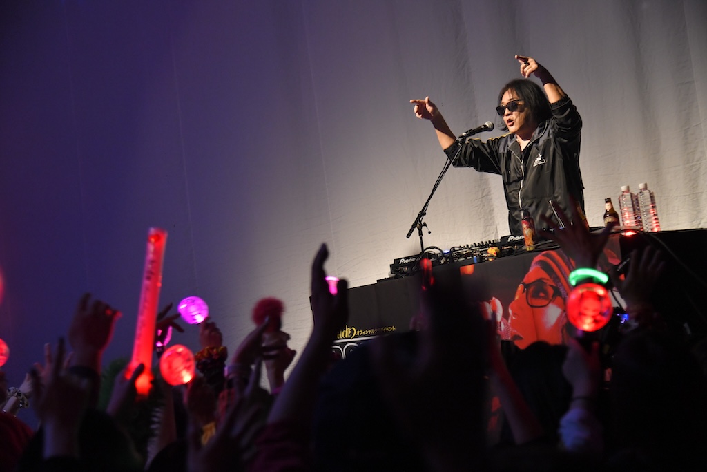 セットチェンジで幕が閉まっている間に、幕前に出てきて準備をしているDJ-INA。スタンバイOKなのになかなかBGMが途切れず「なげーな」と一言漏らした瞬間に音が止まり、STC(木村世治、TAKA、CUTT)の3人とDJ浅井博章がろうそくに火が灯ったバースデーケーキを押してあらわれる。一瞬、びっくりした表情を見せるINAだが、「あ、そーいうことね」とすぐに納得した様子。hideの共同プロデューサーINAのバースデーは12月12日で、hideの1日前なのだ。INAの誕生日を祝ったあと、hideへのバースデーソングをみんなで歌い、DJタイムが始まった。DJブースの中にとどまらず、マイクを持ってステージをあちこち動いて、オーディエンスを巻き込んでいくINA。「FISH SCRATCH FEVER」では「DIEちゃんがこの曲をやりたいっていうのでデータをあげたりしてたんだけど、できなくなっちゃったから応援メッセージを送りたいと思います」とスマホでオーディエンスと一緒にメッセージを撮影。この動画には、緊急入院でイベントに出演できなかったDIEも喜んだことだろう。その後、DJ浅井博章が登場したり、お客さんをステージに上がらせたりと楽しく遊んだあと、「あっという間すぎたので、次はあっちのバー(会場2階のアティック)でDJやってるので遊びに来てください」とひとこと。INAのDJタイムはまだまだ続くのだ。