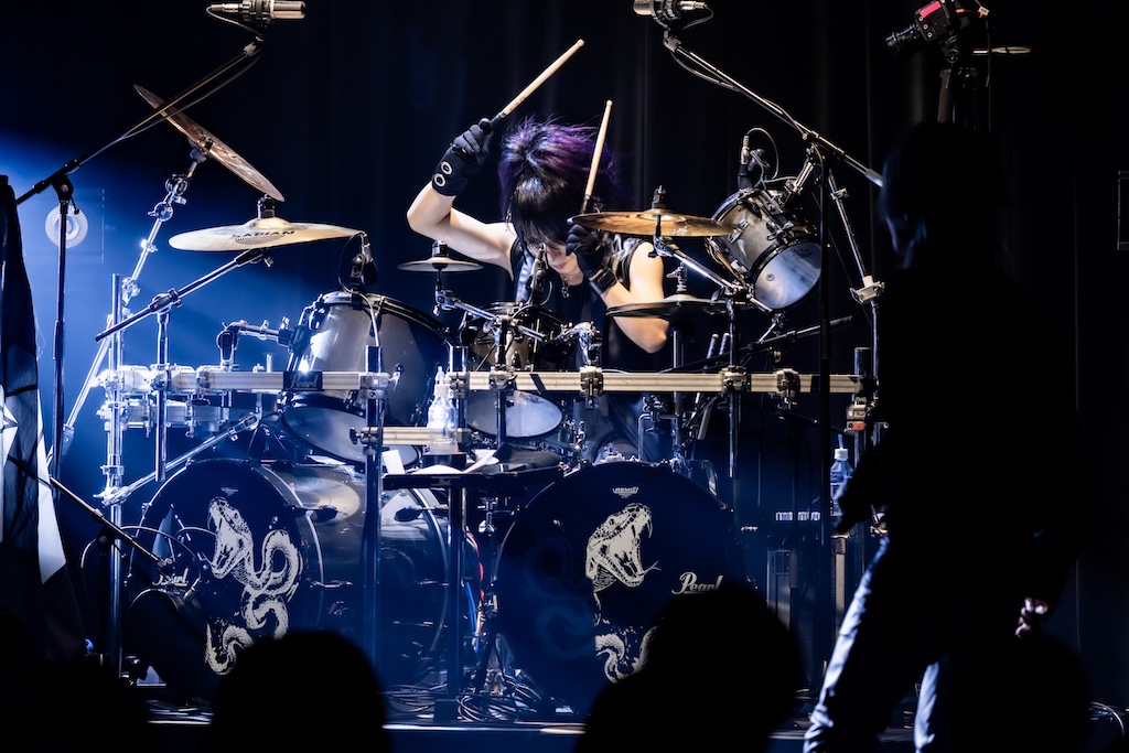 鈍い赤の光が差し込み、kazuyaのギタースクラッチが不穏なムードを漂わせた「PRISONER」を皮切りに場内の熱量を上昇させていったブロックでは、アッパーチューン「ADDICT」でのギターソロや、ライブ登場率の高い「EARNEST GAME」でのラップなど、昨年より療養中のSHUN.(G)の存在を確かに感じさせる流れとなった。そして、オーディエンスの手が揺れた「PARASITIC EMOTION」で場面を転じ、次なるブロックへと流れを繋いだ。