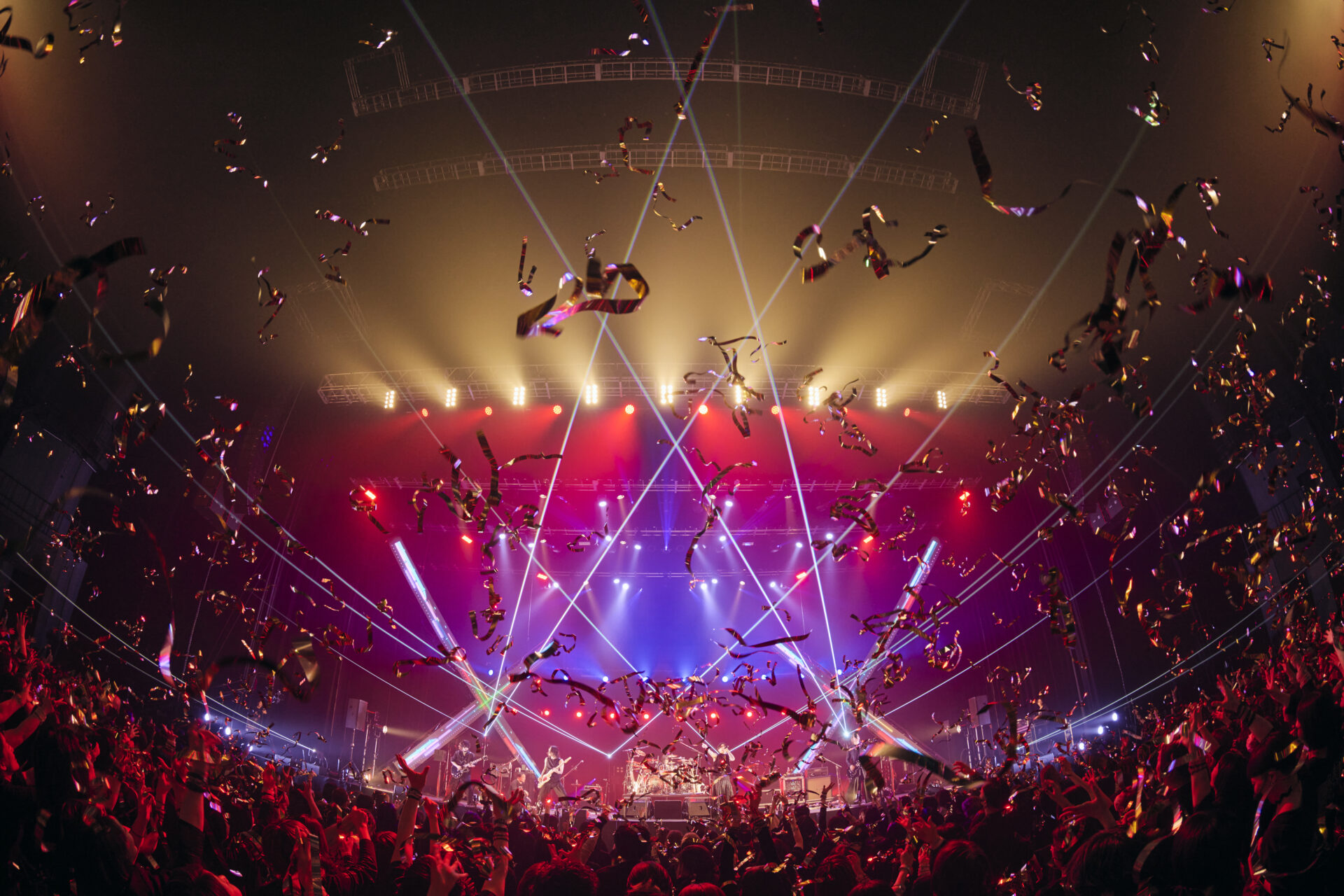 とはいえ、当然ながらlynch.のライブはそうした空気感のまま終わりはしない。葉月が晁直の名前をコールすると短いドラム・ソロが始まり、誰もが次なる曲の正体が“MIRRORS”であることを察知する。しかしドラムの激走に呼応しながらCO2の白煙が噴き出したところで、前述のようなトラブルが再発生。ここで葉月はマイクを通して「ケムリ禁止!」を宣言し、「なんだかすげえ楽しくなってきた!」と笑う。こうした流れが、仕切り直しを経て改めて炸裂した“MIRRORS”の興奮度をいっそう高めることになった。そしてこの曲を皮切りに必殺曲のさらなる連射が繰り広げられると、時間経過と比例しながら場内の熱はいっそうの高まりをみせていく。しかも“GALLOWS”や“PULSE_”といった鉄板曲の連続を経て、葉月の「この日に向かうために作った曲。その曲でひとつになっていくぞ!」との言葉に導かれながら始まったのは、その言葉通り、アニヴァーサリー・イヤーを締め括るこの夜のために作られた“BRINGER”だった。空中を舞う大量の金テープといい、オーディエンスの大合唱の渦といい、まさにクライマックスに相応しい光景がそこに広がっていた。