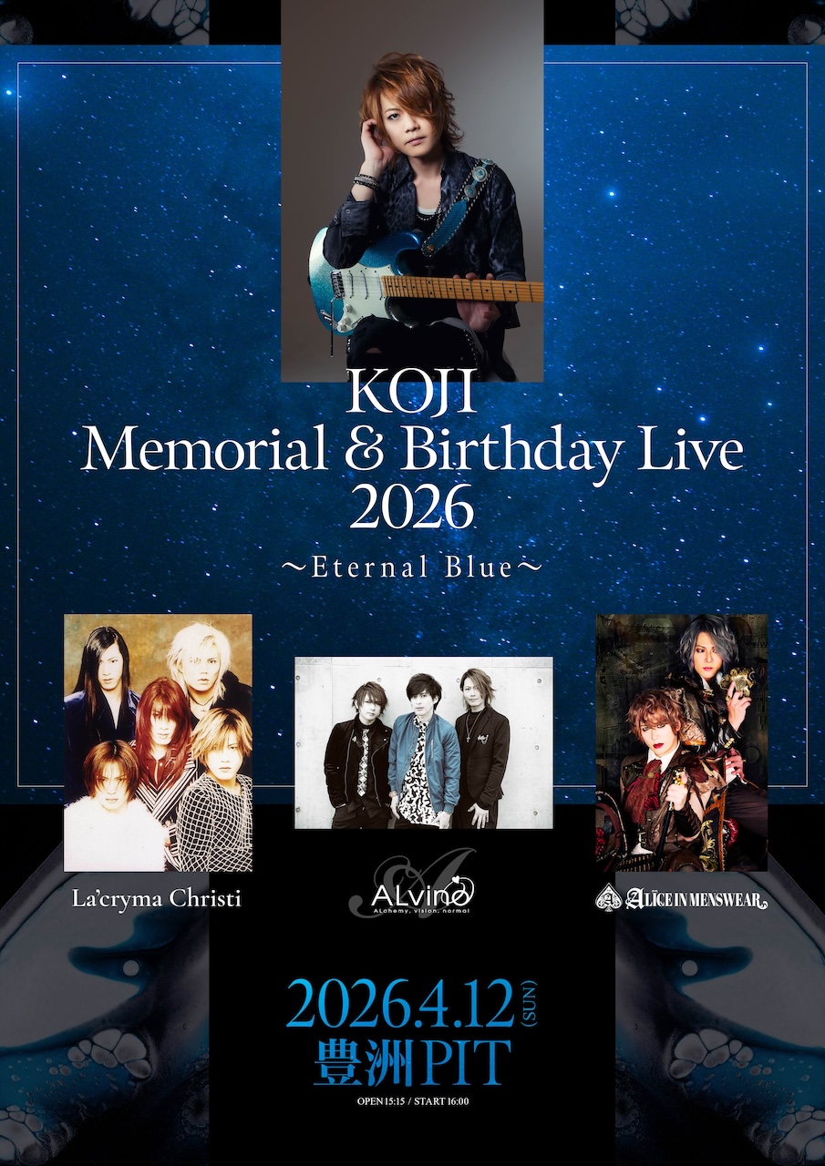 KOJIの所属した3バンドでイベントを行うのは今回が初の試み。2025年11月より期間限定再始動中のラクリマ、同じく11月に“奇跡の復活”として2026年MASCHERAとの2マンを発表したALICE IN MENSWEAR、約2年振りにメンバーとKOJIの音とが邂逅するALvino。音楽性はそれぞれ違うもののKOJIが遺した多彩な楽曲と彼への“愛”を持ち寄り共演する。機材マニアでもあるKOJIが各バンドで使用した楽器を見られるチャンスともいえそうだ。逝去から4年を経て実現するメモリアルライブで、永遠に輝き続けるKOJIの音楽を堪能できる。
