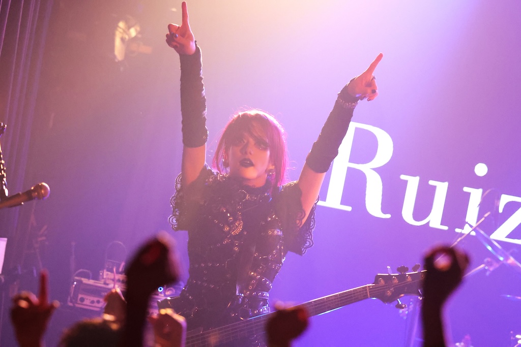いよいよトリはRuiza BANDの出番。ハードナンバー「魔儀」でトップギアのスタートを切ると、Ruiza、Seth(Vo)、Tsunehito(B)、美景(Dr)が気合の入ったアグレッシブなパフォーマンスを叩きつけ、続くダンサブルな「Brain Deceive」でフロアを大きく揺らした。ここでRuizaが「メタルバンドを揃えたいなという夢があって、何十年も活動してきました」と思いを語り、各出演アーティストとの関係性に触れる場面も。そして、「まだ1回しかやっていない新曲」と前置きし、年末公演で初披露されたばかりのヘヴィーチューン「Impulse」を投下。フロアの熱量を急上昇させた。