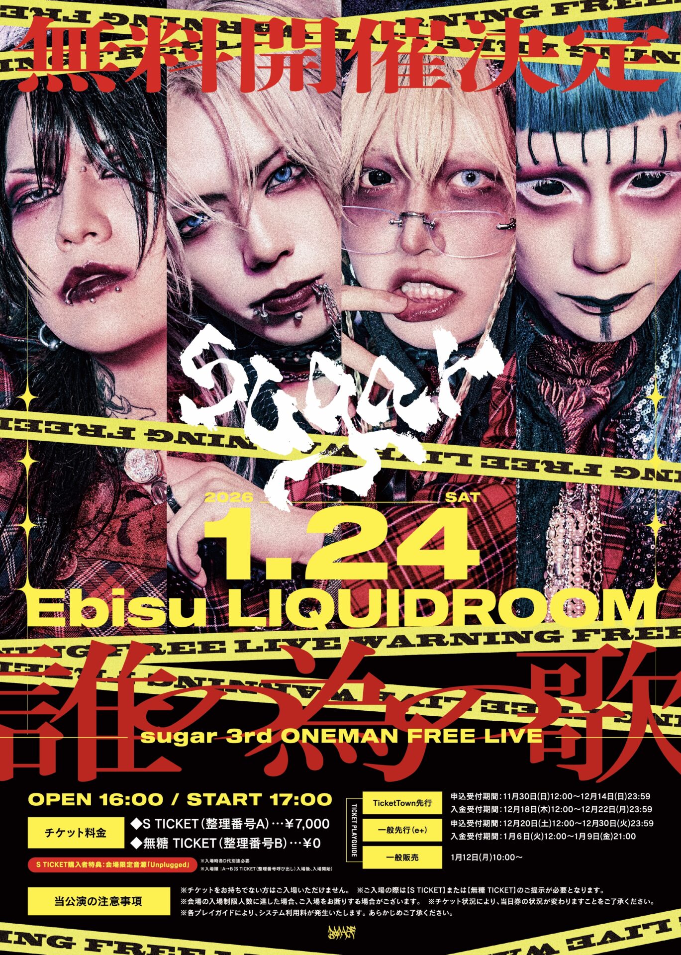 sugarが、3rdワンマンフリーライブ<誰の為の歌>を今週末1月24日(土)に東京・恵比寿LIQUIDROOMで開催する。