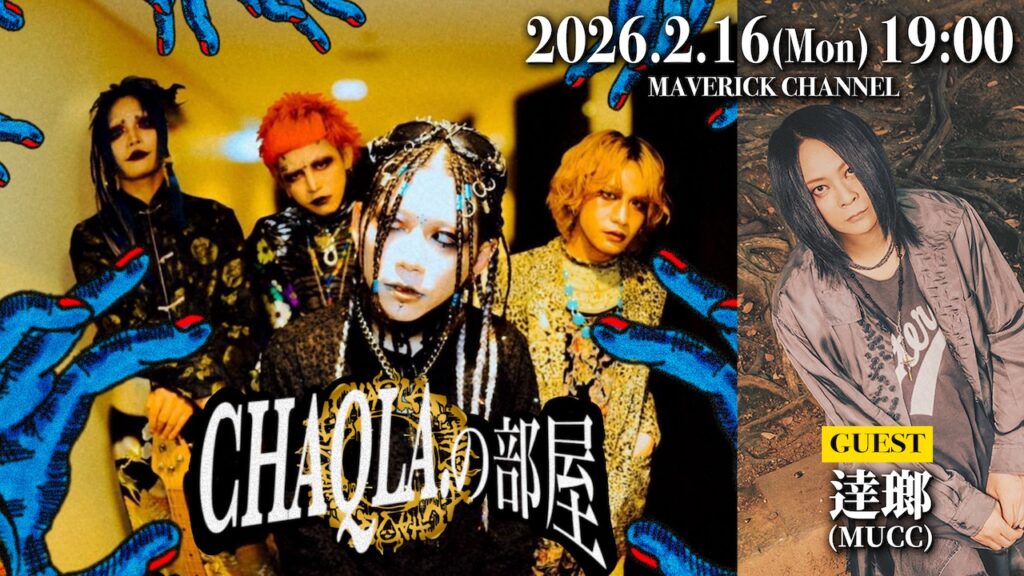鮮烈なヴィジュアルとスピリチュアルな世界観で、シーンにおいて唯一無二の存在感を放つヴィジュアル系バンド・CHAQLA.。彼らが月1回でお届けするMAVERICKチャンネル生配信番組『CHAQLA.の部屋』の次回放送が、2月16日(月)19時に決定した。