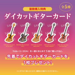 同じ店舗で一度に「hideくじ 2026」5回分をご購入いただくと、先着でダイカットギターカード1枚をランダム(全5種)でプレゼントします。