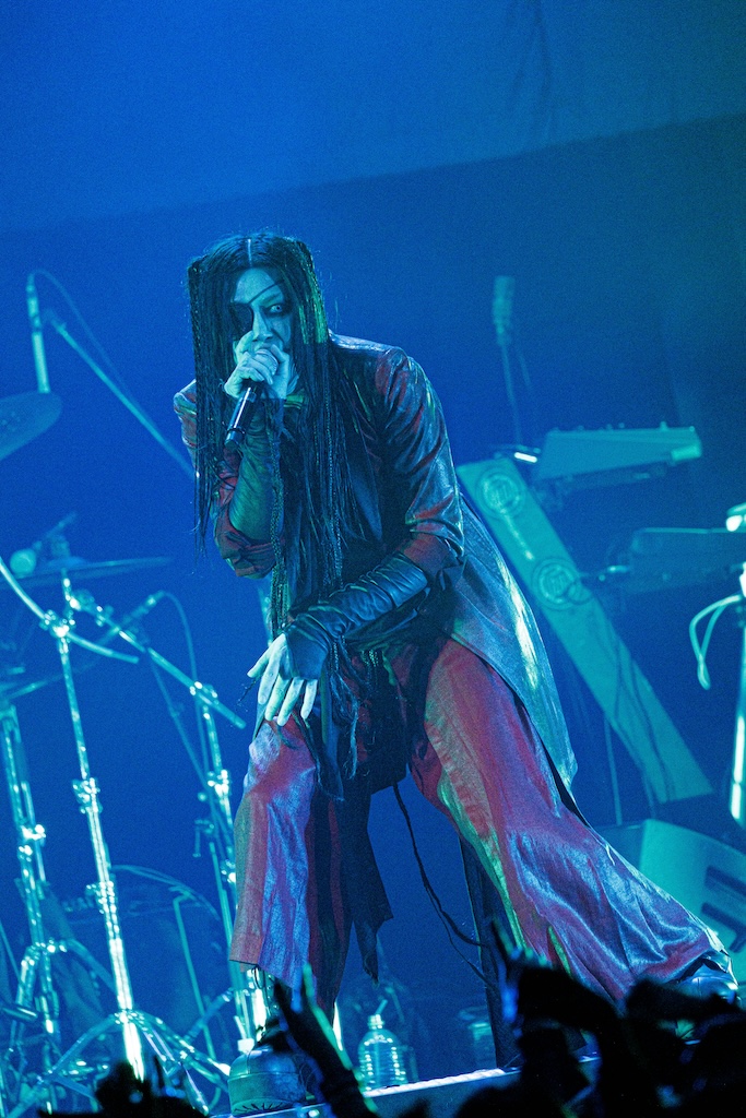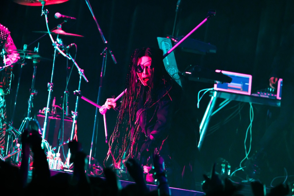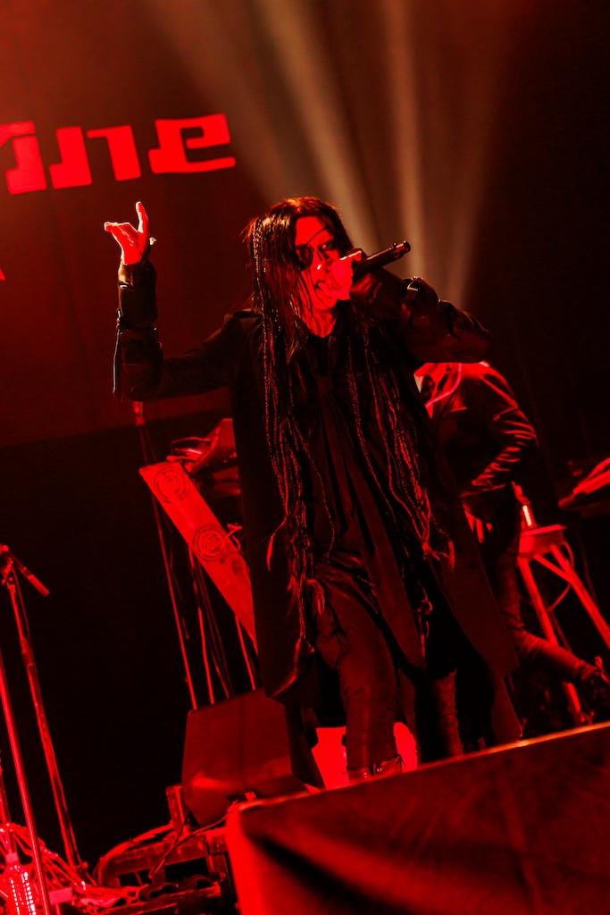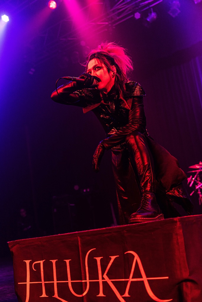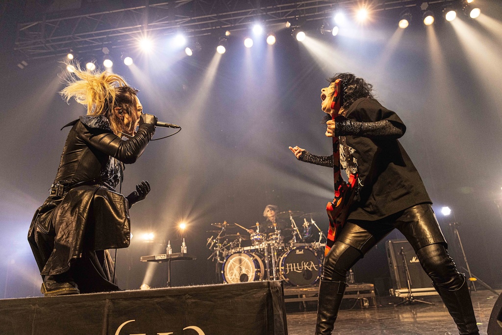 初日の公演は団長とmachineでサポート・ドラムを務めるCHARGEEEEEE..による軽妙なMCを経て、JILUKAのライブから始まった。現在のJILUKAは“EGM(エレクトロ×ゴシック×メタル)”というコンセプトのもとに独自の音楽性を構築していることで知られている。Ricko(Vo)のアグレッシブなシャウトやSena(G)のソリッドかつフラッシーなギター、Boogie(B)とZyean(Dr)による重厚なリズム・セクションなどを押し出したハードネスとメロディアスなサビや荘厳なオーケストラ、デジタル・テイストなどを融合させた楽曲は非常に魅力的だ。ドラマチックなサウンドとメンバー全員が織り成す激しいステージングを活かしたJILUKAのライブの駆り立て力は圧倒的だし、今回のライブでは「Screamer」にKiyoshiが飛び入りしたことも相まってオーディエンスは熱いリアクションを見せ、「ULTRA BEAST HAMMER BATTLE」は上々の滑り出しとなった。