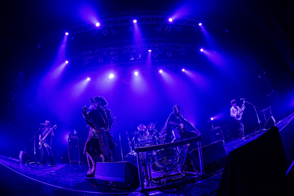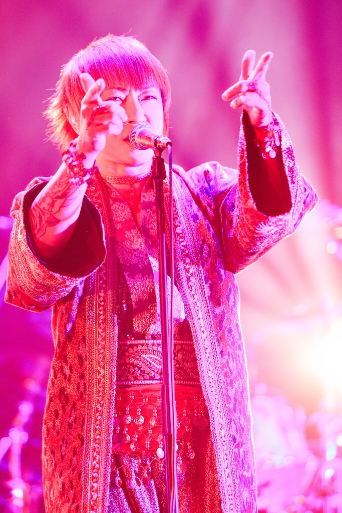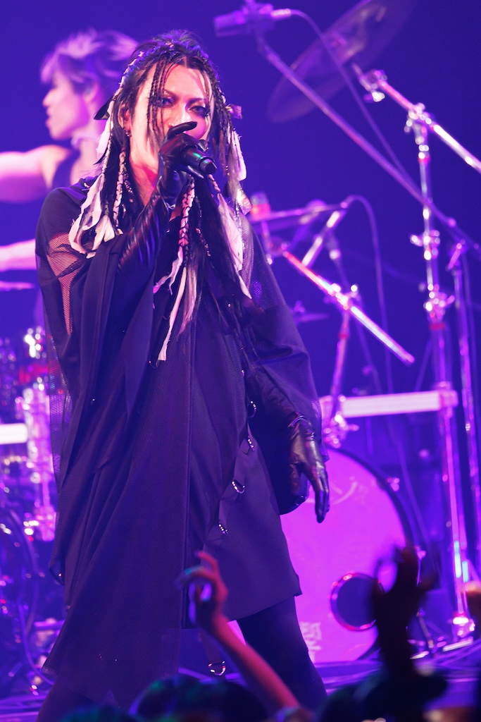 続いてステージに立ったPsycho le Cémuのライブは「君がいる世界」からスタート。メンバー全員が極彩色の衣装に身を包んだカラフルなヴィジュアルとキャッチーなサウンド、そしてseek(B)を始めとしたフィジカルなステージングなどにより、ライブが始まると同時に場内をPsycho le Cémuの世界に染めたのはさすがといえる。さらに、ライブ中盤ではDAISHI(Vo)とAYA(G)、YURAサマによるダンスをフィーチュアしたスタイルで「シャクティ シャクティ アスティ」や「激愛メリーゴーラウンド」(HAKUEIが参加した)などを披露。妖艶かつ華やかなステージでオーディエンスを惹き込んだ後、グルーヴィな「MOON PRISONER」や煌びやかに駆け抜ける「愛の唄」で気持ちを引き上げるという巧みな構成でオーディエンスを大いに沸かせてみせた。