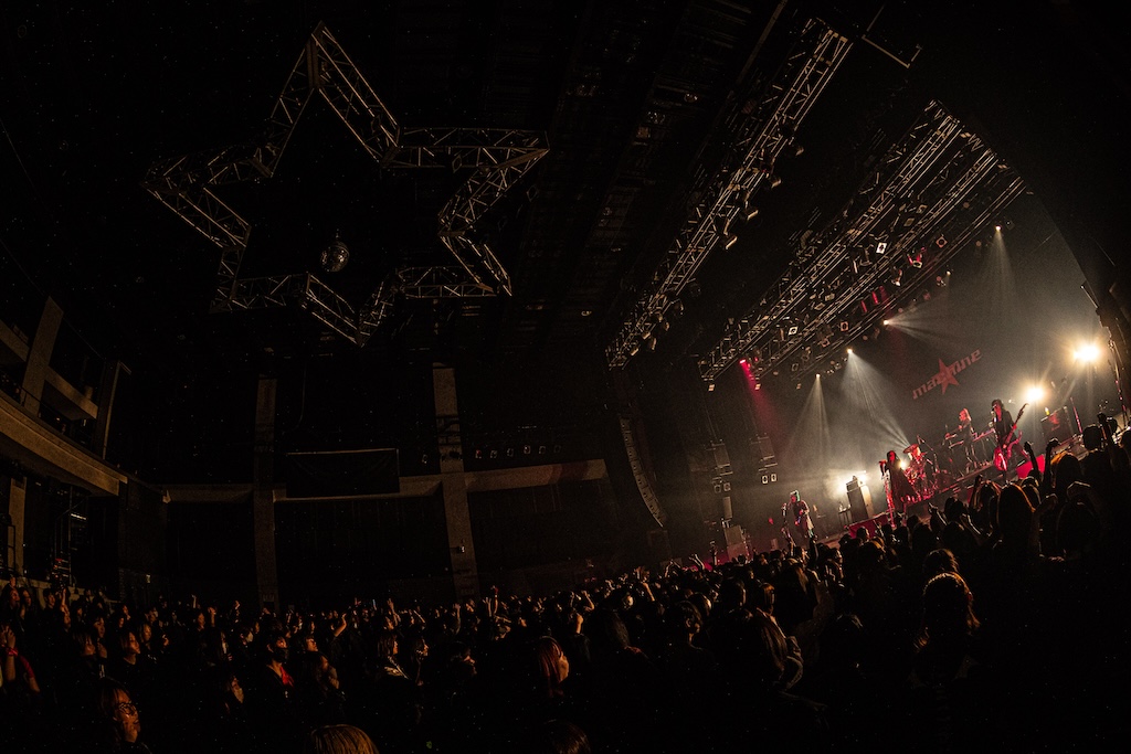 場内が終始いい空気感に包まれてイベントは進んでいき、いよいよmachineのライブが始まった。オーディエンスが発する大歓声と熱い拍手を浴びてステージに立った彼らは荒々しい「Hero 2025」やファットにロールするサウンドを纏った「Baby Blood 2025」、退廃的な「invader 2025」などを続けてプレイ。ライブが始まった瞬間からアクセル全開で突き進む彼らの迫力は圧倒的で、場内のボルテージがさらに高まったことが如実に感じられた。