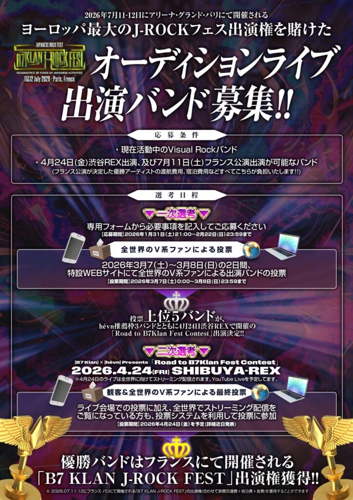 このフェスへの最後の一枠の出演権をかけたオーディションライブ・[B7 Klan]×[hévn]Presents「Road to B7Klan Fest Contest」の開催が決定した。現在活動中のヴィジュアル系ロックバンドに応募資格があり、オーディションライブは4月24日(金)、渋谷REXにて開催される。