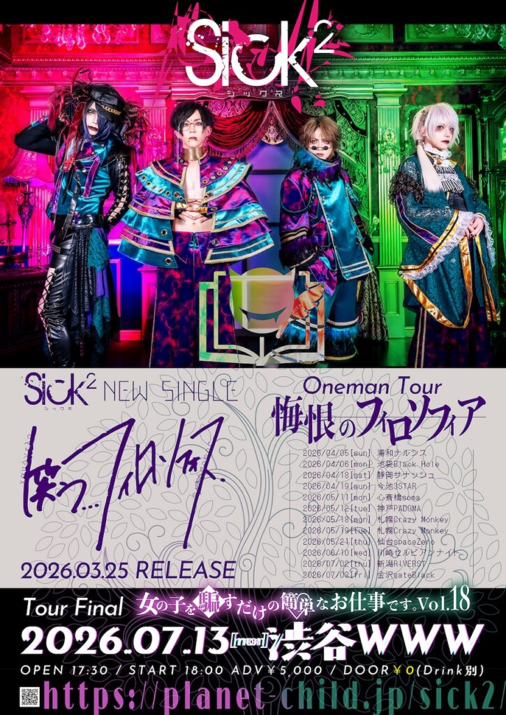 結成13周年ライブを終えたSick²が、3月25日にニューシングル『笑う…フィロソフォス』をリリースする。新ビジュアルの公開とともに、新作を引っ提げたワンマンツアー「悔恨のフィロソフィア」の開催が発表された。