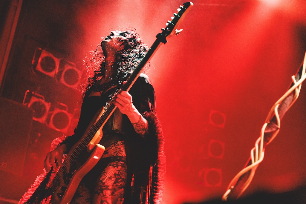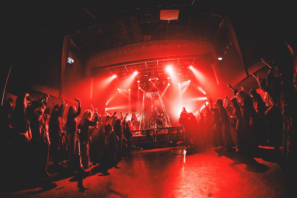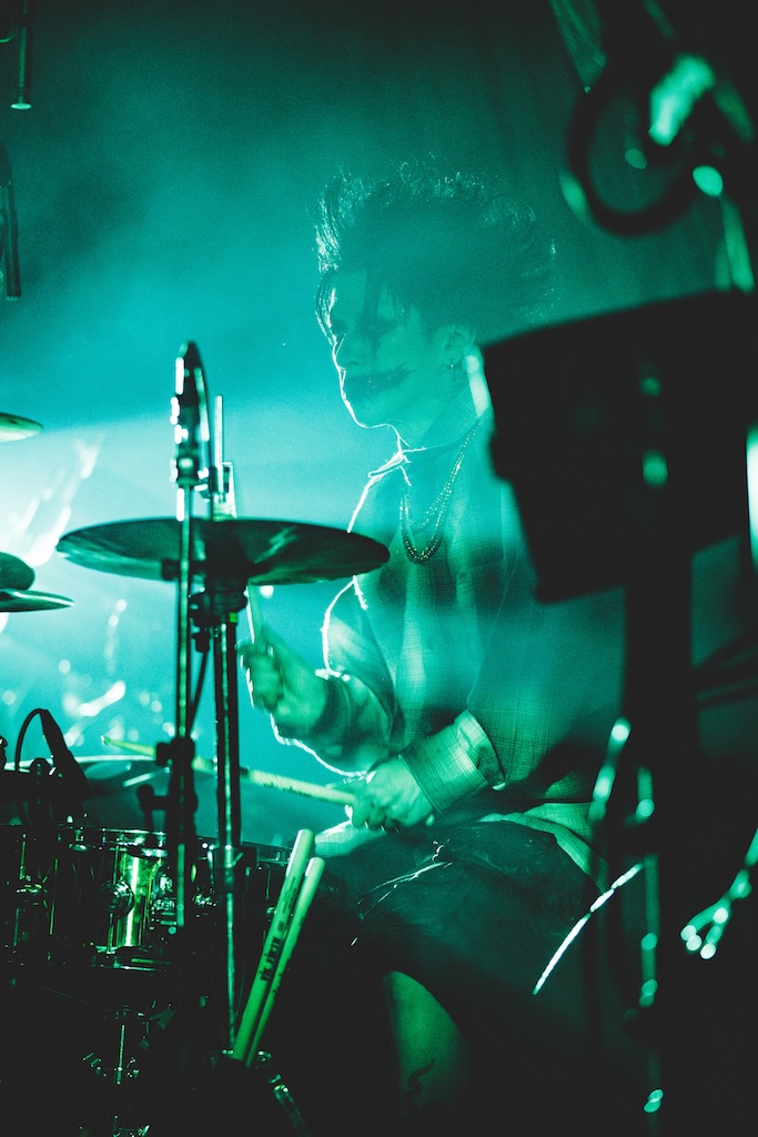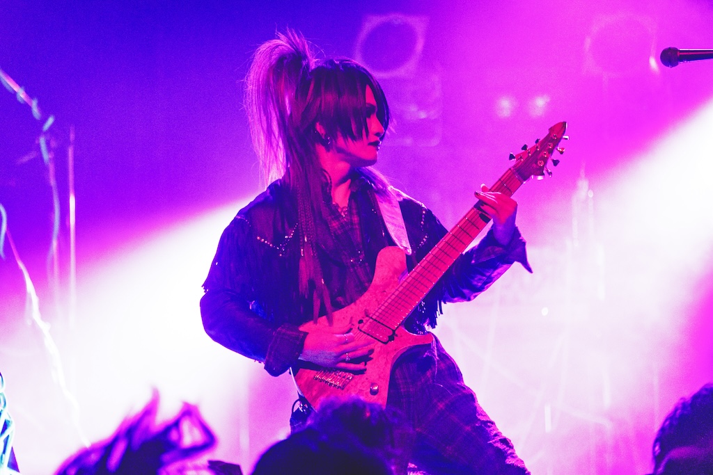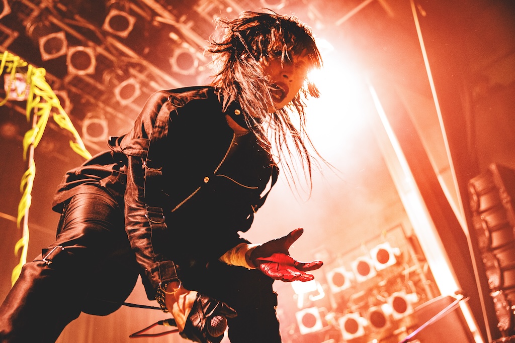 圧巻な没入感と、感情を自由に放出していく時間とが交錯するライヴは、いよいよ終盤へ。ブラックメタルを思わせる「THE LIBRA」、さらに初お披露目となった「Trite and nauseating」では、瞬時に轟音へと身を委ねていく観客のエキセントリックな様子を前に、不敵な笑みを浮かべるクラウンメイクのYoshiatsu。綴もしきりに「生きてんのか!?」と問いかけ、場内には互いの鼓動で満たし合うようなエモーショナルな光景が広がっていた。さらに、進藤渉のベースがうねりを起こした「Echoes of the Hidden Self」、「魂置いてけ。やれ!やれ!亅と綴が焚きつけた「E,M,M,M」ではタイゾのスラップ奏法も炸裂し、観客はモッシュを起こしていく。秀逸なリズムやブレイクが光るループセクションの中には、純粋にバンドを楽しむメンバーの衝動が垣間見られたことも印象的だった。