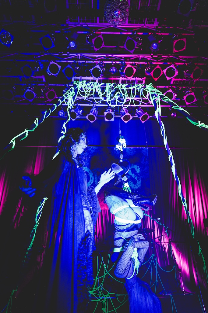 冒頭に触れたDRUGSのライヴにおける“刺激”を語る上で欠かせないのが、同期に縛られないバンドサウンドが生む臨場感はもちろん、視覚にもアプローチするアート性。それが、タイゾとYoshiatsuが音を重ねる中、進藤渉が繰り広げたロープパフォーマンスセクションだった。妖しげな儀式のような、スリリングかつ魅惑的な光景に目を奪われ、緊縛で吊られたモデルのアクロバットを伴い披露されたのは「NEW ORDER」。まさしく、DRUGSが初めて世の中に放った同曲のMVに覚えた衝撃を原体験させるような一幕は、ありふれたものを排除し、新たな秩序が動き始めたことを説いているようでもあった。加えて、こうしたセオリーに生きること、それが“業”とも言わんばかりに、体感として理解させる力を持っていた。