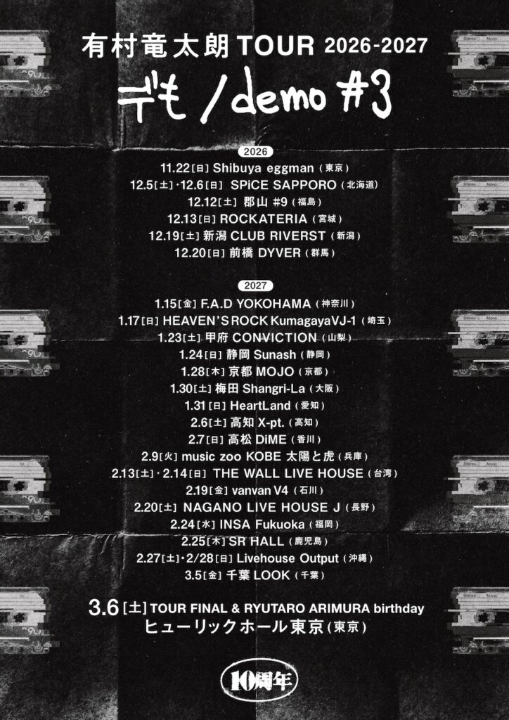 さらにアルバムのリリースに伴い、全国23都市・全27公演を巡るツアー、「有村竜太朗 TOUR 2026- 2027「デも/demo #3」」の開催も決定。有村の個人活動としては初めて訪れる土地も含まれており、 各地で新たな実験が繰り広げられる予定だ。