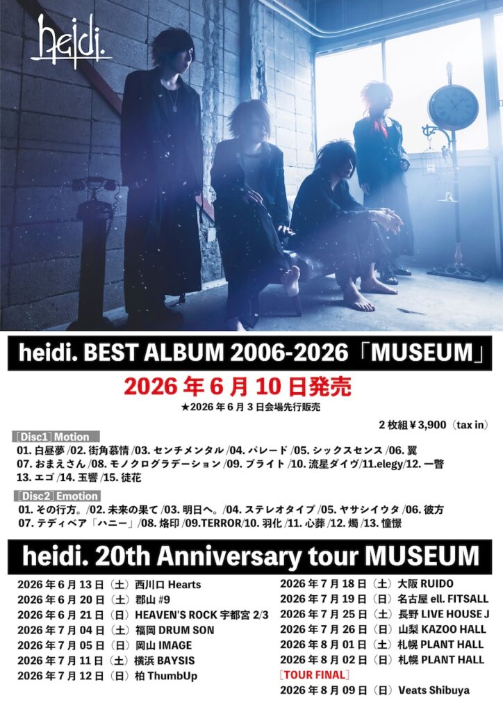 20周年を記念して、メンバーセレクションベストアルバム『heidi. BEST ALBUM 2006-2026「MUSEUM」』の発売、そして本作を引っさげた全国ツアー「heidi. 20th Anniversary tour MUSEUM」の開催が決定した。