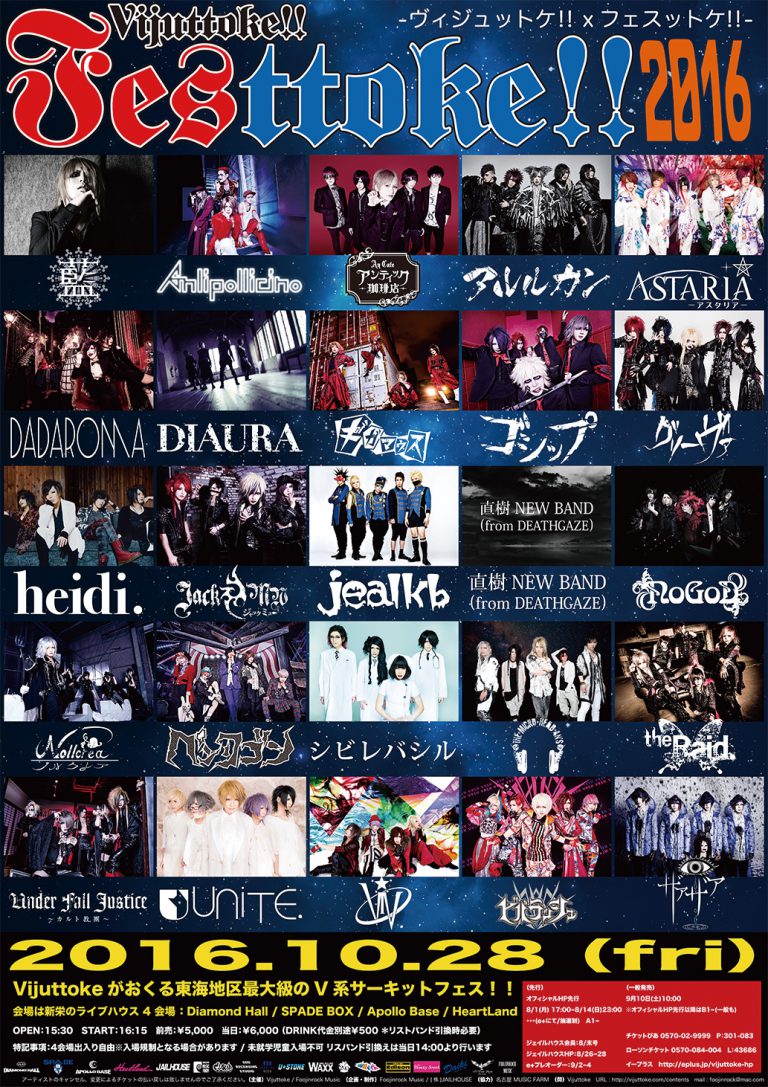 2014年、名古屋初のヴィジュアル系サーキットフェスとして産声をあげた「Vijuutoke!! Festtoke!!」が今年も開催決定。しかも今年は新栄DIAMOND HALL、SPADE BOX、HeartLand、A… -